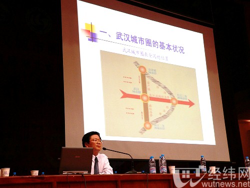 陶教授在报告中从“武汉城市圈基本状况、‘两型社会’综合配套改革实验区新内涵、武汉城市圈‘两型社会’建设核心和重点、建设武汉城市圈的着力点”四方面进行阐述,指出,目前武汉市经济、产业、人口最密集、最具活力,但整体实力不强,主要是因为资源浪费和环境污染。因此,我们要增强自主创新能力,做到“资源节约环境友好”。
